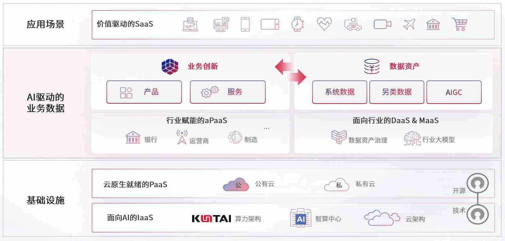 数字时代,,,,围绕企业数字化转型的关键要素,,,k豆钱包数码开创性的提出数云融合战略和技术体系框架,,,着力在云原生、、、、数字原生、、、AI原生和信创产业上架构产品和服务能力,,,为处在不同数字化转型阶段的快消零售、、、汽车、、金融、、、医疗、、、、政企、、教育、、运营商等行业客户提供泛在的敏捷IT能力和融合的数据驱动能力,,,构建跨界融合创新的数字业务场景和新业务模式,,,助力企业级客户建立面向未来的核心能力和竞争优势,,,,全面推动社会的数字化、、智能化转型升级。。。。